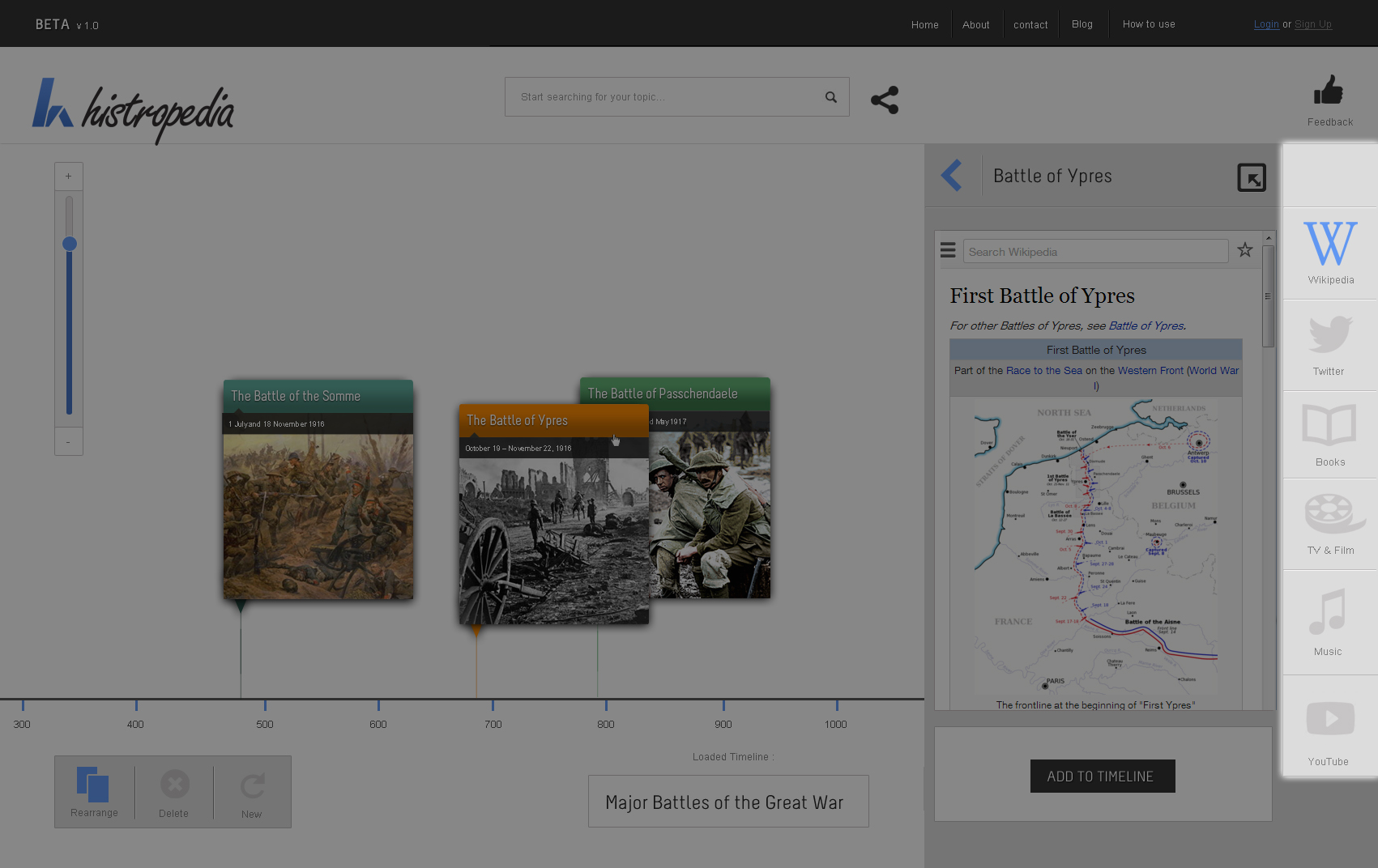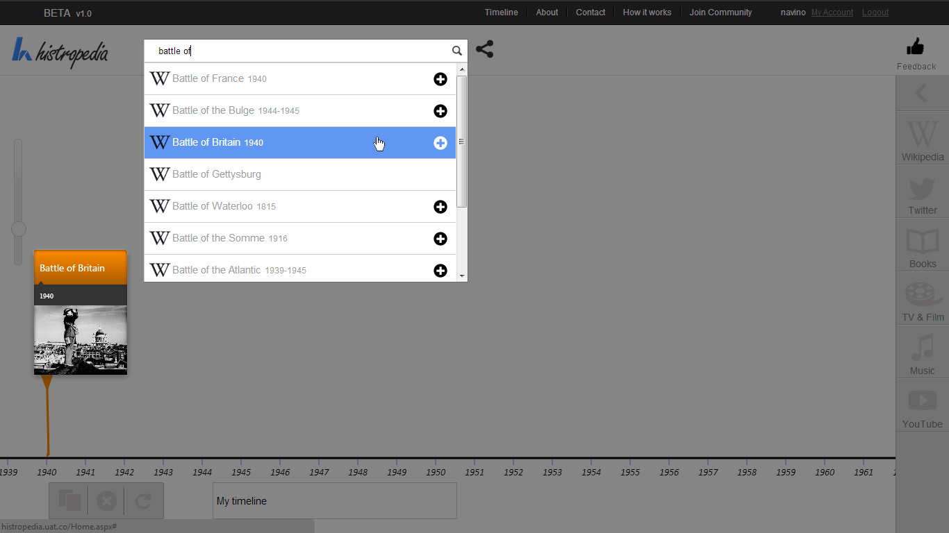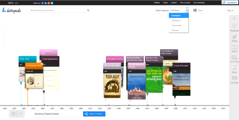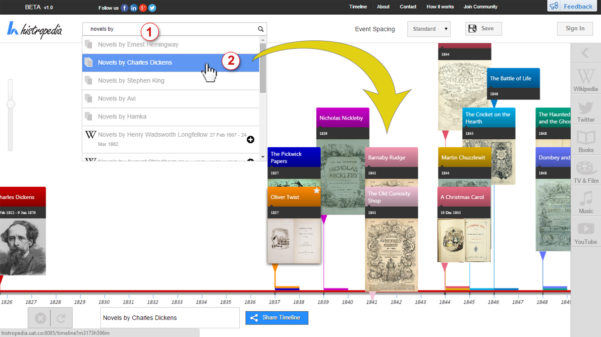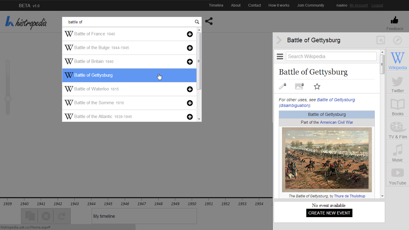 Discover over 300,000 timelines, created directly from Wikipedia categories, straight from the Histropedia search box. Only 5 results are visible at one time so some refining of search terms might be required to find the timeline you are looking for.