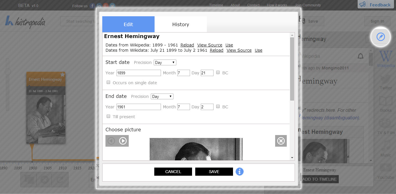 If you find an event that has the wrong date or picture you can edit that event and fix it for everyone using Histropedia.